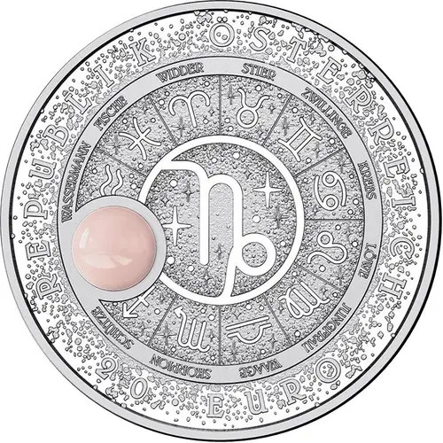 | Descripción del anverso | The obverse of Capricorn features a ring naming all 12 signs of the zodiac and their symbols. The symbol for Capricorn adorns the centre in large letters. At the edge of the circle, a pink rose quartz, which stands for the constellation Capricorn, shines in all its beauty. Round and smoothly cut, it gets its shine from the natural structure of the stone. |