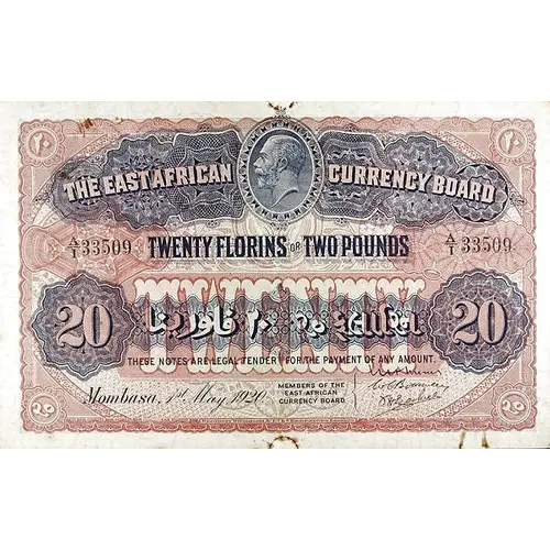 | Obverse lettering | THE EAST AFRICAN CURRENCY BOARD TWENTY FLORINS OR TWO POUNDS THESE NOTES ARE LEGAL TENDER FOR THE PAYMENT OF ANY AMOUNT |