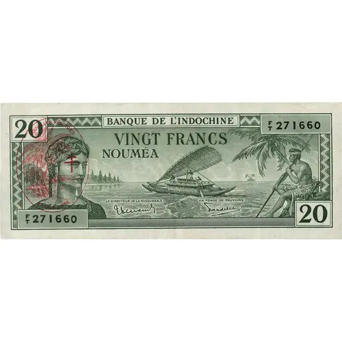 | Opis líce | BANQUE DE L`INDOCHINE VINGT FRANCS NOUMÉA 20 (Translation: Bank of Indochina Twenty Francs Noumea) |