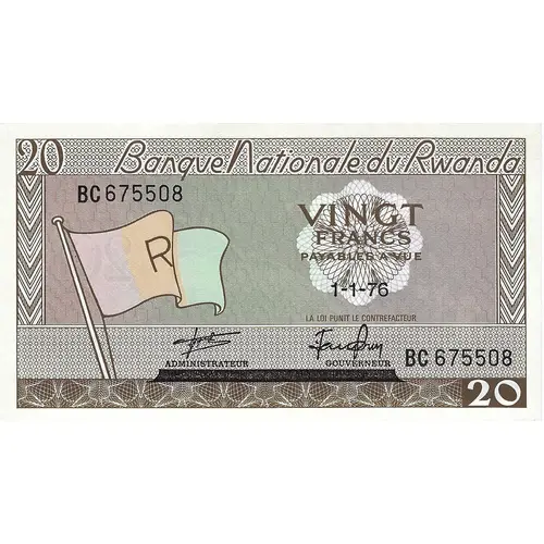 20 Banque Nationale du Rwanda BC 675508 VINGT FRANCS PAYABLES A VUE R 1-1-76 LA LOI PUNIT LE CONTREFACTEUR ADMINISTRATEUR GOUVERNEUR BC 675508 20 |