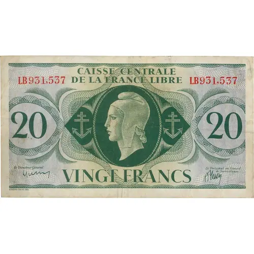 | Obverse lettering | CAISSE CENTRALE DE LA FRANCE LIBRE LB931,537 Le Directeur Général Le Président du Conseil de Surveillance VINGT FRANCS EDMUND DULAC DEL. (Translation: Central Fund of Free France Twenty Francs) |