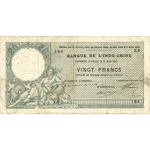 | Legenda del dritto | Décrets des 21 Janvier 1875; 20 Fevrier 1888; 16 Mai 1900 & 3 Avril 1901 BANQUE DE L`INDO-CHINE PAPEETE (TAHITI), le 23 Mars 1914. VINGT FRANCS PAYABLE MONALLE LOCALE AU PORTEUR (Translation: Decrees of January 21, 1875 ; February 20, 1888 ; May 16, 1900 and April 3, 1901 Bank of Indochina Papeete (Tahiti), March 23th., 1914. Twenty Francs payable in cash to bearer) |
