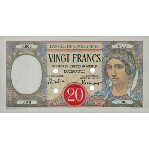 | Obverse lettering | BANQUE DE L`INDO-CHINE VINGT FRANCS PAYABLES EN ESPÈCES AU PORTEUR DJIBOUTI LE PRESIDÉNT LE DIRECTEUR GÉNÉRAL 20 CL. SERVEAU FEC. E. DELOCHE SC. (Translation: Bank of Indochina. Twenty francs. Payable in cash to bearer. The president, the general director.) |