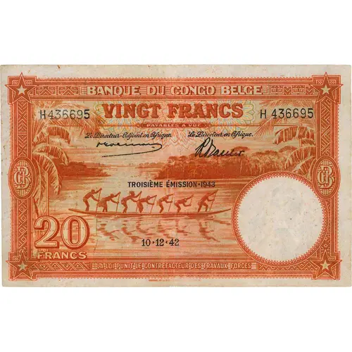 BANK VAN BELGISCH CONGO TWINTIG FRANK BETAALBAAR OP ZICHT DERDE UITGIFTE-1943 DE NAMAKER WORDT DOOR DE WET MET DWANGARBEID GESTRAFT |