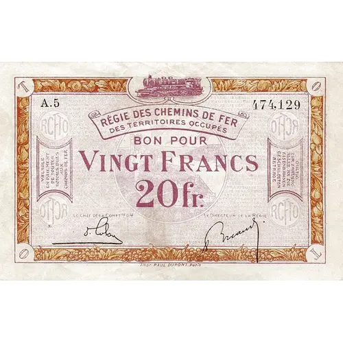 REGIE DES CHEMINS DE FER DES TERRITOIRES OCCUPES BON POUR VINGT FRANCS 20fr. RCFTO | OTFCR VALABLE EN PAIEMENT DE TOUTES SOMMES DUES AUX CHEMINS DE FER GULTIG ZUR ZAHLUNG ALLER AN DIE EISENBAHNEN GESCHULDETEN BETRAGE OTFCR | RCFTO LE CHEF DE LA COMPT TE G LE - LE DIRECTEUR DE LA REGIE Impr. PAUL DUPONT. PARIS |