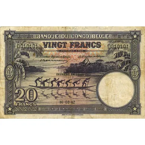 | 表面の銘文 | BANQUE DU CONGO BELGE VINGT FRANCS PAYABLES A VUE DEUXIEME EMISSION - 1942 LA LOI PUNIT LE CONTREFACTEUR DES TRAVAUX FORCÉS |