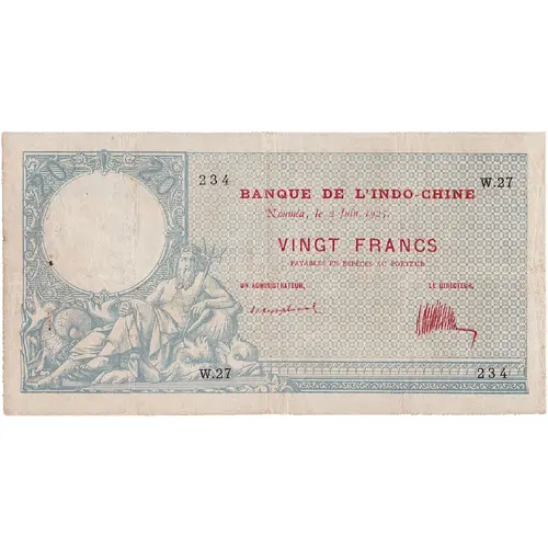 | Arka yüz lejandı | L`ARTICLE 139 DU CODE PÉNAL PUNIT DES TRAVAUX FORCÉS CEUX QUI AURONT CONTREFAIT OU FALSIFIÉ LES BILLET DE BANQUE AUTORISÉS PAR LA LOI AINSI QUE CEUX QUI AURONT FAIT USAGE DE CES BILLETS CONTREFAITS OU FALSIFIÉS BANQUE DE L`INDO-CHINE 20 FRANCS A. BRAMTOT ET G DUVAL FEC. CH - WULLSCHLEGER SC. (Translation: Article 139 of the penal code punishes with forced labor those who have counterfeit or falsified banknotes authorized by law as well as those who have made use of these counterfeit or falsified notes. Bank of Indochina.) |