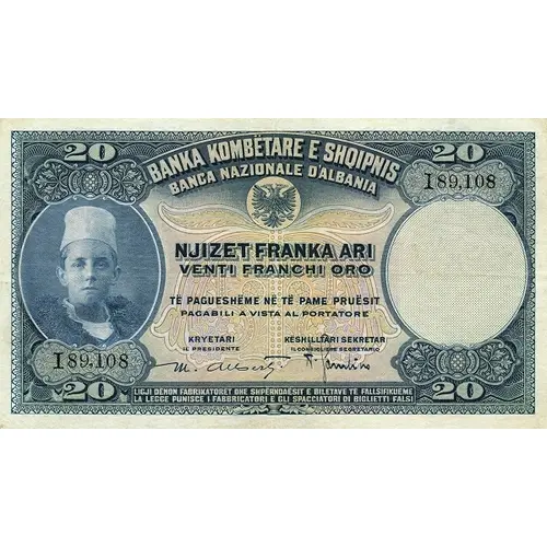 | Leyenda del anverso | BANKA KOMBËTARE E SHQIPNIS BANCA NAZIONALE D`ALBANIA NJIZET FRANKA ARI VENTI FRANCHI ORO TË PAGUESHËME NË TË PAME PRUËSIT PAGABILI AL VISTA AL PORTATORE LIGJI DENON FABRIKATURET DHE SHPERNDAESIT E BILETAVE TE FALLSIFIKUEME LA LEGUE PUNISCE I FABRICATORI E GLI SPACCIATORI DI BIGLIETTI FALSI (Translation: National Bank of Albania Twenty Gold Francs Payable to the bearer The Law punishes to fabricators and distributors of falses banknotes.) |