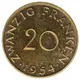 | Chữ khắc mặt sau | ZWANZIG FRANKEN 20 ·1954· (Translation: Twenty francs) |
