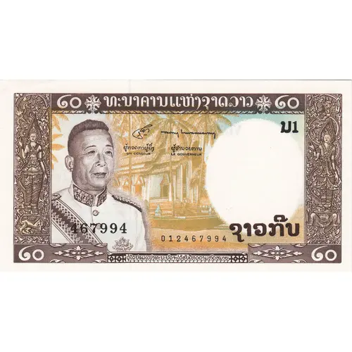 | Obverse description | Lao text; King Sisavang Vatthana; temple; palm trees. |
