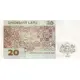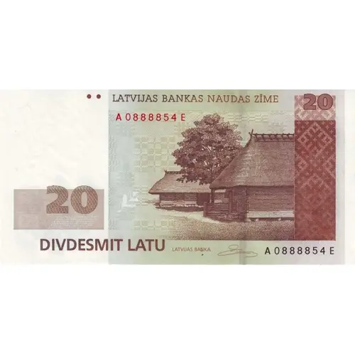 | Надписи оборотной стороны | DIVDESMIT LATU 20 © LATVIJAS BANKA 1992 20 LATVIJAS BANKAS NAUDAS ZĪME 2004 (Translation: Twenty latu 20 © Bank of Latvia 1992 20 Bank of Latvia banknote 2004) |