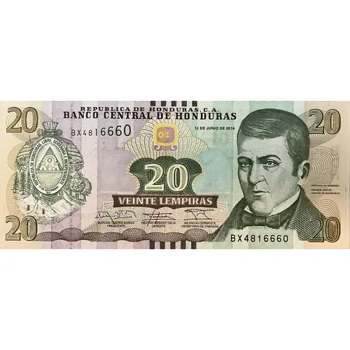 | Ön yüz lejandı | REPUBLIC DE HONDURAS, C. A. BANCO CENTRAL DE HONDURAS 20 VIENTE LEMPIRAS DIONISIO DE HERRERA PRIMER JEFE DE ESTADO DE HONDURAS (Translation: Republic of Honduras, C. A. Central Bank of Honduras 20 Twenty Lempiras Dionisio de Herrera First Head of State of Honduras) |