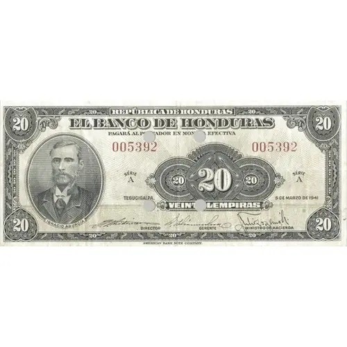 | Leyenda del anverso | REPÚBLICA DE HONDURAS EL BANCO DE HONDURAS PAGARÁ AL PORTADOR EN MONETA EFECTIVA 20 TEGUCIGALPA, 5 DE MARZO DE 1941 VEINTE LEMPIRAS AMERICAN BANK NOTE COMPANY. (Translation: Republic of Honduras The Bank of Honduras Will pay to the Bearer in currency Tegucigalpa, March 5th., 1941 Twenty Lempiras) |