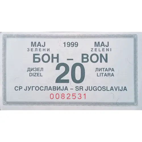 | Leyenda del anverso | MAJ 1999 MAJ 3EЛEHИ ZELENI БOH - BON ДИ3EЛ DIZEL 20 ЛИTAPA LITARA CP JYГOCЛABИJA SR JUGOSLAVIJA 0082531 |