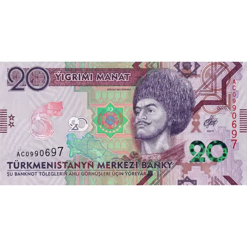 | Obverse lettering | ÝIGRIMI MANAT TÜRKMENISTANYŇ MERKEZI BANKY ŞU BANKNOT TÖLEGLERIŇ ÄHLI GÖRNÜŞLERI ÜÇIN ÝÖREÝÄR (Translation: Twenty Manat, Central Bank of Turkmenistan, This banknote is valid for all types of payments) |