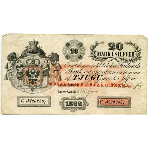| Arka yüz lejandı | 20 МАРКЬ СЕРЕБРОМЪ Предъяьителю сего Финляндскій Банкъ ьыдаетъ двадцать маркъ серебромъ 20 MARKKAA HOPEASSA Tästä setelistä maksaa Suomenmaan Pankki vaadittaissa KAKSIKYMMENTÄ markkaa hopeassa. Tämän Setelin väärentäminen tahi muukaaminen, kiun myöskin semmosen rahan kauppaaminen, rangaistaan Marraskuun 2 (14) päivänä 1812 annetun Keisarillisen asetuksen jälkeen. (Translation: 20 MARKS IN SILVER From this banknote, the Bank of Finland will pay, on demand, TWENTY marks in silver. [Small text at bottom] The forgery or alteration of this Banknote, as well as the trading of similar money, will be punished under the Imperial decree issued on November 2 (14) 1812.) |