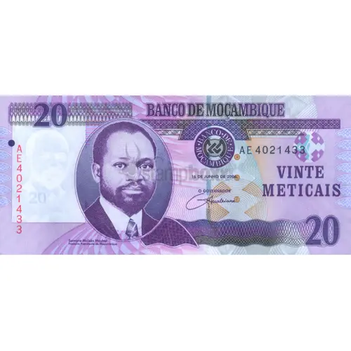 | Legenda do anverso | BANCO DE MOÇAMBIQUE 20 VINTE METICAIS (Translation: BANK OF MOZAMBIQUE 20 TWENTY METICAIS) |