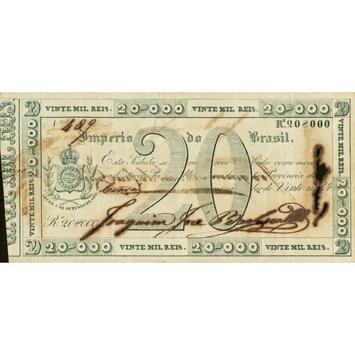 20 VINTE MIL REIS. 20$000. VINTE MIL REIS. 20$000. 20 VINTE MIL REIS. 20$000. VINTE MIL REIS. 20$000. Nº ___ Rs. 20$000 Imperio do Brasil Esta cedula será recebida como moeda nas Estações Publicas desta Provincia d_ _____ no valor de Vinte mil rs. 20 Rs. 20$000. 20 20$000 VINTE MIL REIS. 20$000 VINTE MIL REIS. 20 (Translation: 20$000. Twenty Thousand Réis Empire of Brazil This ballot will be received as currency at the Public Stations of this _____ Province in the amount of Twenty Thousand Réis.) |