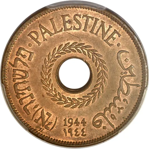 توضیحات روی سکه Central hole, encircled by a stylized olive wreath surrounded by Palestine in Hebrew, English and Arabic with date in English and Arabic below