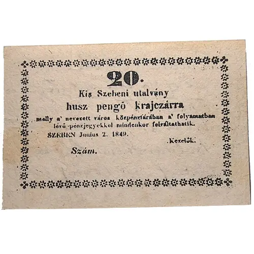 | Obverse lettering | 20 Kis Szebeni utalvány husz pengő krajczárra melly a` nevezett város közpénztárában a folyamatban lévő pénzjegyekkel mindenkor felváltattatik. SZEBEN Junius 2. 1849. (Translation: 20 Kis Szeben payment order for 20 silver krajczár, which in the public offices of the named city, shall be exchanged to equivalent banknotes all the time. SZEBEN, 2nd of June, 1849) |