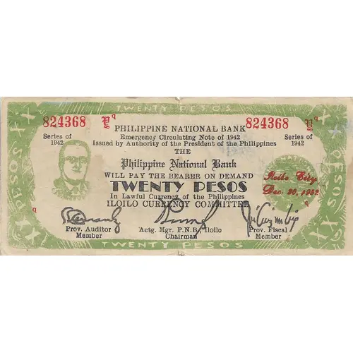 PESOS 20 PHILIPPINE NATIONAL BANK TWENTY PESOS ILOILO CITY PHILLIPINES DECEMBER 30 1942 EMERGENCY CIRCULATING NOTE OF 1942 |