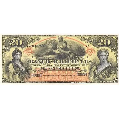 | Legenda do anverso | Santiago de Chile, Marzo 1º 1888 BANCO DE D.MATTE Y Ca. 20 Pagará al portador á la vista en Santiago VEINTE PESOS en moneda corriente American Bank Note Co. New York (Translation: Santiago of Chile, March 1st., 1889 Bank of D.Matte & Co. Will pay to bearer at sigh in Santiago Ten Pesos in currency) |