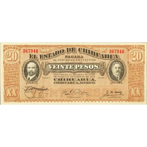 EL ESTADO DE CHIHUAHUA PAGARA AL PORTADOR, EN EFECTIVO VEINTE PESOS, CONFORME AL DECRETO MILITAR DE FECHA 10 DE FEBRERO DE 1914 CHIHUAHUA, CHIHUAHUA, MEXICO. VEINTE PESOS (Translation: The State of Chihuahua will pay to the bearer in cash Twenty Pesos according to the military decree dated 10 February 1914) |