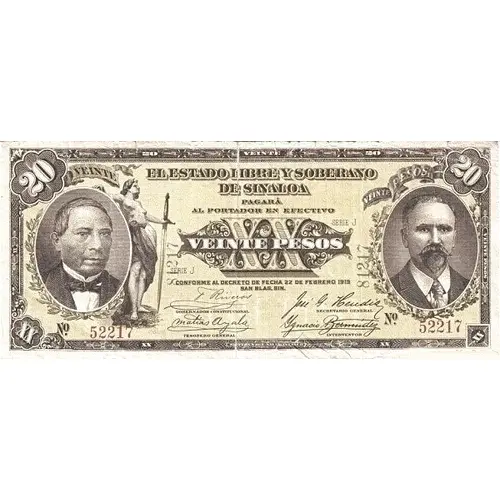 Opis líce EL ESTADO LIBRE Y SOBERANO DE SINALOA PAGARÁ EL PORTADOR EN EFECTIVO VEINTE PESOS CONFORME AL DECRETO FECHA 22 DE FEBRERO 1914 SAN BLAS, SIN.