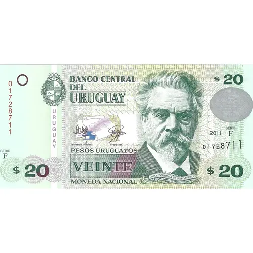 | Leyenda del anverso | BANCO CENTRAL DEL URUGUAY PESOS URUGUAYOS VEINTE MONEDA NACIONAL (Translation: Central Bank of Uruguay Pesos Uruguayos Twenty National currency) |