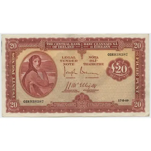 | Obverse lettering | The Central Bank of Ireland Banc Ceannais na hÉireann Legal Tender Note Nóta Dlí-Thairgthe Twenty Pounds Sterling Payable to Bearer on Demand in London Tá Fiche Punt Sterling Iníoctha as an Nóta so le n-a Shealbhóir ar n-a Éilamh san do i Lundain |