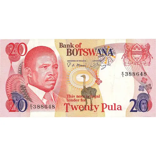 Leyenda del anverso BANK OF BOTSWANA THIS NOTE IS LEGAL TENDER FOR TWENTY PULA