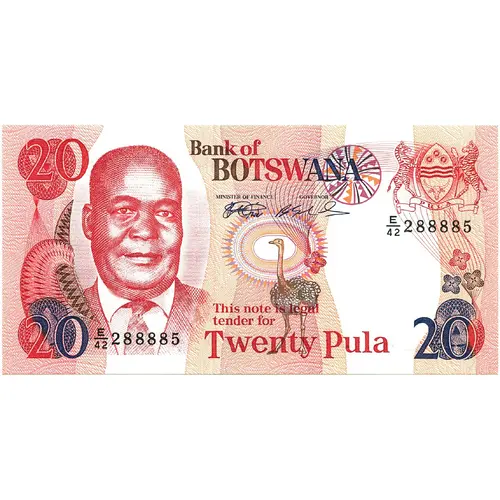 | Ön yüz lejandı | Bank of Botswana this note is legal tender for Twenty Pula |