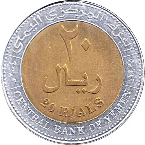| Chữ khắc mặt trước | البنك المركزي اليمني ٢٠ ١٤٢٥ ٢٠٠٤ ريال (Translation: 20 RIALS 1425 2004 CENTRAL BANK OF YEMEN) |