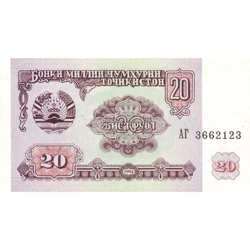 | Obverse lettering | БОНКИ МИЛЛИИ ҶУМҲУРИИ ТОҶИКИСТОН Бист 20 рубл 1994 (Translation: National Bank of the Republic of Tajikistan, Twenty Ruble) |