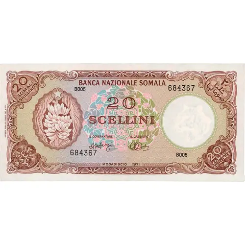 | Надписи лицевой стороны | 20 SOMALI SHILLINGS BANCA NAZZIONALE SOMALA 20 SCELLINI MOGADISCIO 20 SOMALI SHILLINGS |