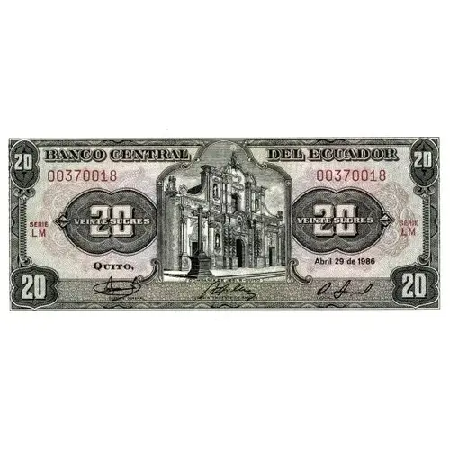 | Obverse lettering | BANCO CENTRAL DEL ECUADOR VIENTE SUCRES QUITO (Translation: Central bank of Ecuador Twenty Sucres Quito) |