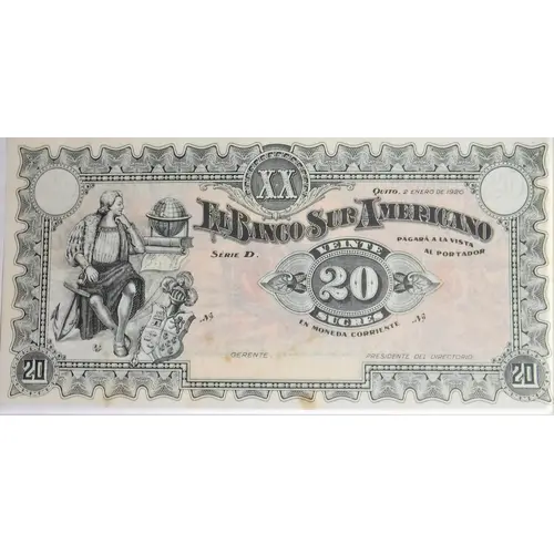 | Légende de l’avers | XX Quito, 2 DE ENERO DE 1920 El Banco Sur Americano PAGARÁ A LA VISTA AL PORTADOR VEINTE 20 SUCRES (Translation: XX (20) Quito, January 2nd., 1920 The South American Bank will pay at sight to the bearer twenty 20 Sucres) |