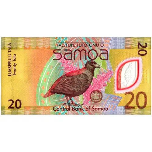 | Reverse lettering | LUASEFULU TALA Twenty Tala FALETUPE TUTOTONU O SAMOA 20 20 Central Bank of Samoa 20 (Translation: Central Bank of Samoa) |