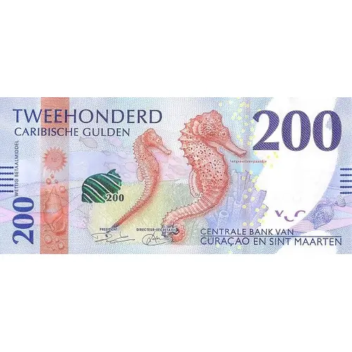 | توضیحات روی اسکناس | Dutch text; giant tun shell in blue-to-green OVI; Hippocampus reidi (longsnout seahorse). |