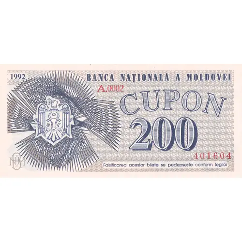 | Obverse lettering | 1992 BANCA NATIONALA A MOLDOVEI CUPON 200 Falsificarea acestor bilete se pedepseste conform legilor |