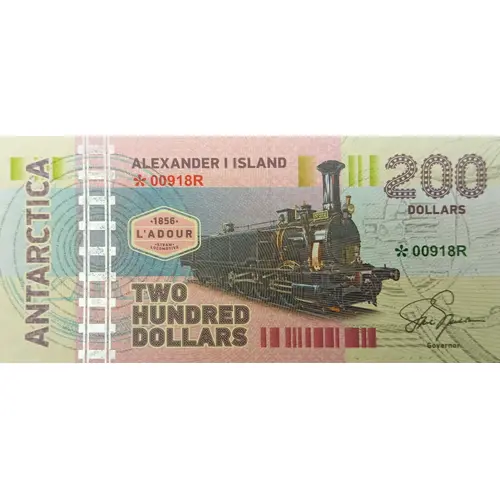 | Надписи лицевой стороны | ANTARCTICA ALEXANDER I ISLAND 200 DOLLARS 1856 L`ADOUR STEAM LOCOMOTIVE TWO HUNDRED DOLLARS |