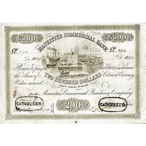 MAURITIUS COMMERCIAL BANK PROMISE TO PAY THE BEARER ON DEMAND THE SUM OF TWO HUNDRED DOLLARS FORTY POUNDS STERLING COLONIAL CURRENCY VALUE RECEIVED FOR THE MAURITIUS COMMERCIAL BANK |
