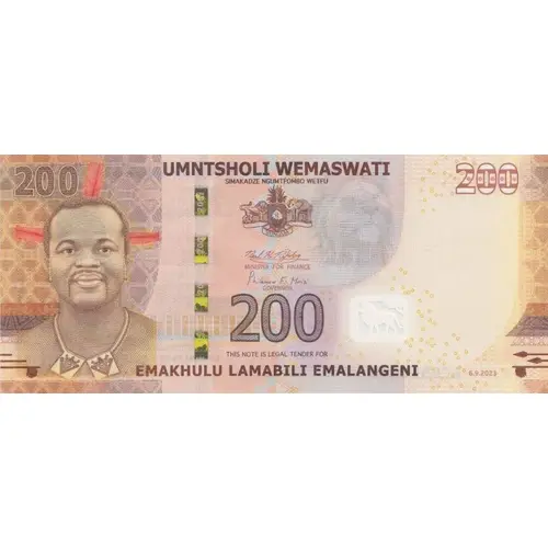 Orange. English and Swazi text; King Mswati III; coat of arms with lion and elephant flanking shield topped with crown of feathers (lidlabe); lion’s head; standing lion. Windowed security thread with demetalized 200 CBE. |