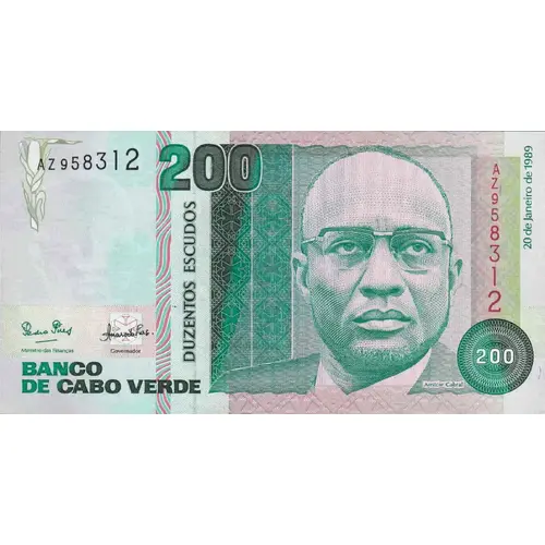 | Opschrift voorzijde | BANCO DE CABO VERDE 200 DUZENTOS ESCUDOS 20 de Janeiro de 1989 (Translation: Bank of Cape Verde Two Hundred Escudos January 20, 1989) |