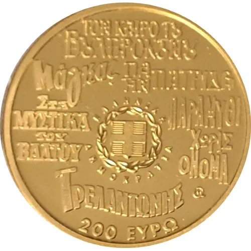 | Chữ khắc mặt trước | EΛΛHNIKH ΔHMOKPATIA ΤΟΝ ΚΑΙΡΟ ΤΟΥ ΒΟΥΛΓΑΡΟΚΤΟΝΟΥ ΜΑΓΚΑΣ ΓΙΑ ΤΗΝ ΠΑΤΡΙΔΑ ΣΤΑ ΜΥΣΤΙΚΑ ΤΟΥ ΒΑΛΤΟΥ ΠΑΡΑΜΥΘΙ ΧΩΡΙΣ ΟΝΟΜΑ ΤΡΕΛΑΝΤΩΝΗΣ 200 ΕΥΡΩ (Translation: HELLENIC REPUBLIC THE TIME OF THE BULGAR KNOCK TOUGH GUY FOR THE HOMELAND IN THE SECRETS OF THE SWAMP FAIRY TALE WITH NO NAME TRELANTONIS 200 EURO) |