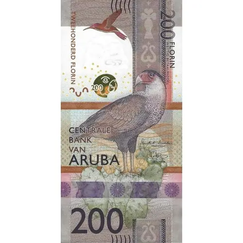 | نوشتههای پشت اسکناس | TWEEHONDERD FLORIN WETTIG BETAALMIDDEL 200 CENTRALE BANK VAN ARUBA 1 januari 2019 AUTEURSRECHT CENTRALE BANK VAN ARUBA © (Translation: Two Hundreds Florin Legal Tender 200 Central Bank of Aruba January 1, 2019 Copyright Central Bank of Aruba ©) |