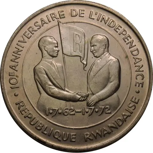 | Obverse lettering | · 10e ANNIVERSAIRE DE L`INDEPENDANCE · REPUBLIQUE RWANDAISE· 1·7·62 - 1·7·72 (Translation: 10th Anniversary of Independence. Republic of Rwanda.) |