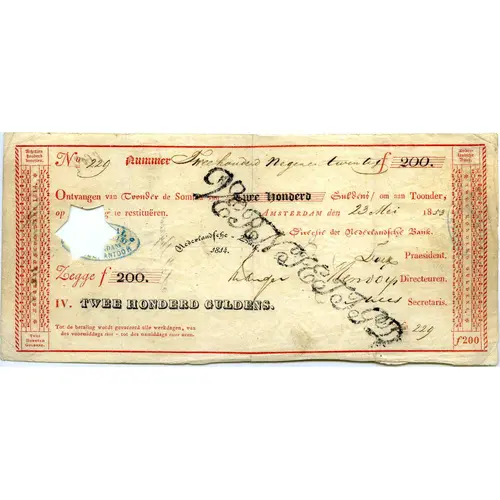 | Legenda awersu | NEDERLANDSCHE BANK. Ontvangen van Toonder de Somma van Twee Honderd Guldens / om aan Toonder, op vertooning te restituëren. Amsterdam, den 23 Mei 1853. Nederlandsche-Bank President - Directeur - Secretaris Legge f 200. (Translation: Bank of Netherlands. Received from Bearer the Somma of a Two Hundred Guilders, to restimese to Bearer upon presentation. Amsterdam, the May 23, 1853. Bank of Netherlands. President - Director - Secretary 200) |