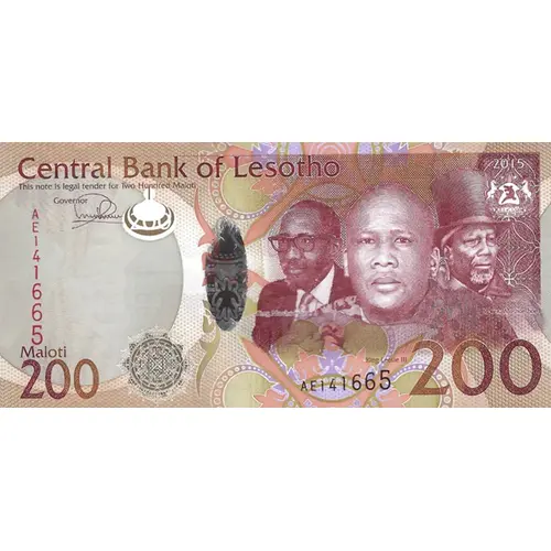 CENTRAL BANK OF LESOTHO THIS NOTE IS LEGAL TENDER FOR TWO HUNDRED MALOTI MALOTI 200 |