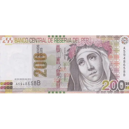 (Translation: 200 Central Bank of Reserve of Peru 200 Nuevos Soles (=New Suns) 200 Saint Rose of Lima)